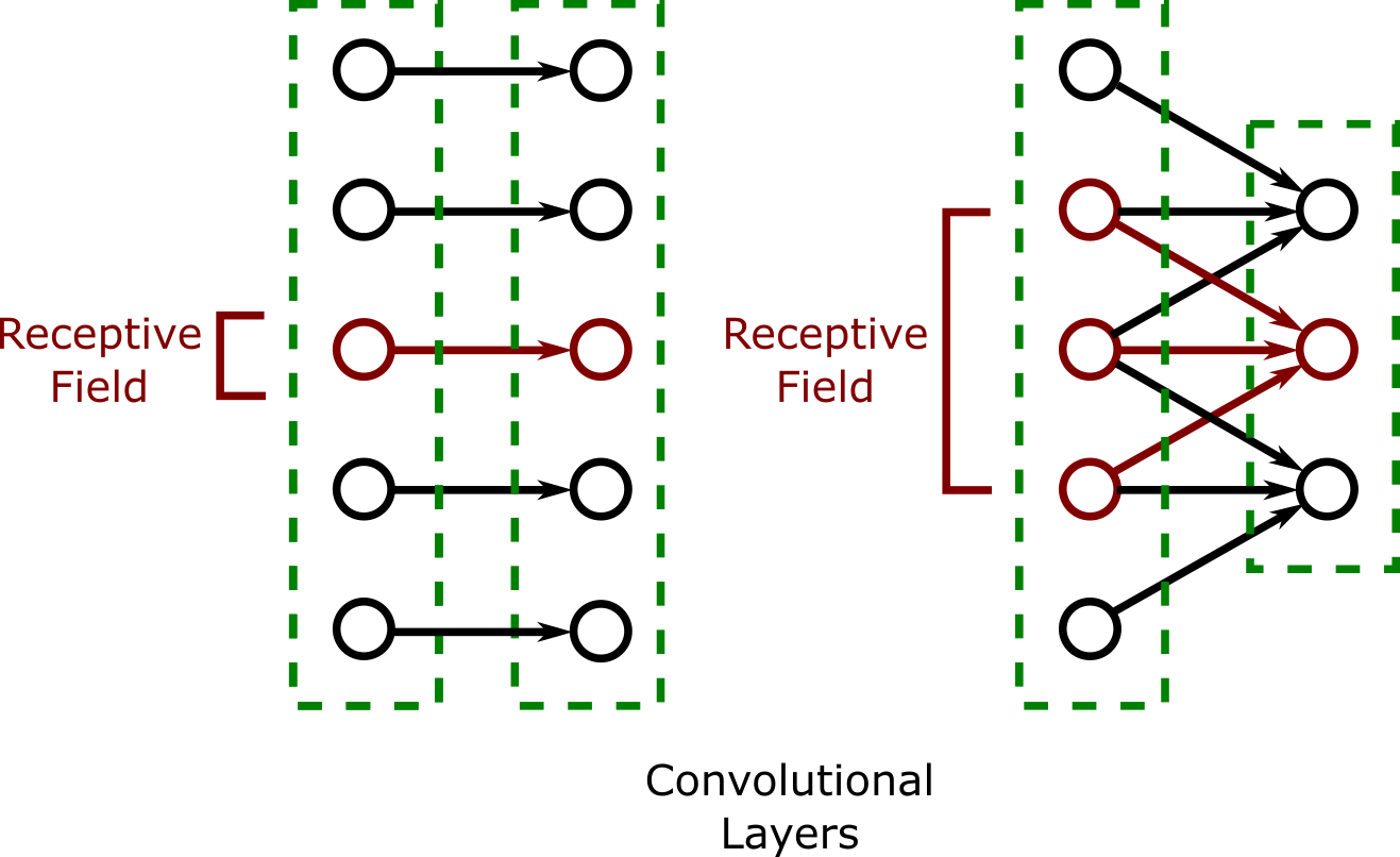 The figure below shows how the size of the network changes as the user (client code) selects a receptive field of size one and a receptive field of size 3.