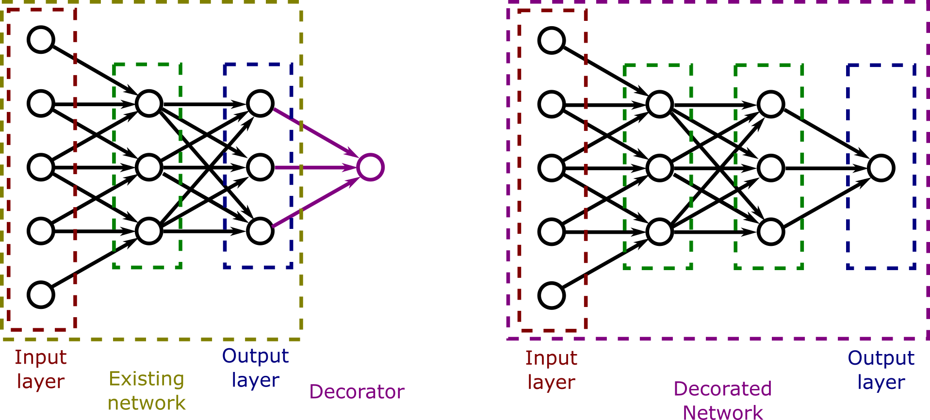 The decorator takes the output of its network as its input, and the output of the decorator is the output of a new network: The decorated network. The decorated network has the same inputs as the underlying network, but produces a new output by adding one layer to the underlying network.