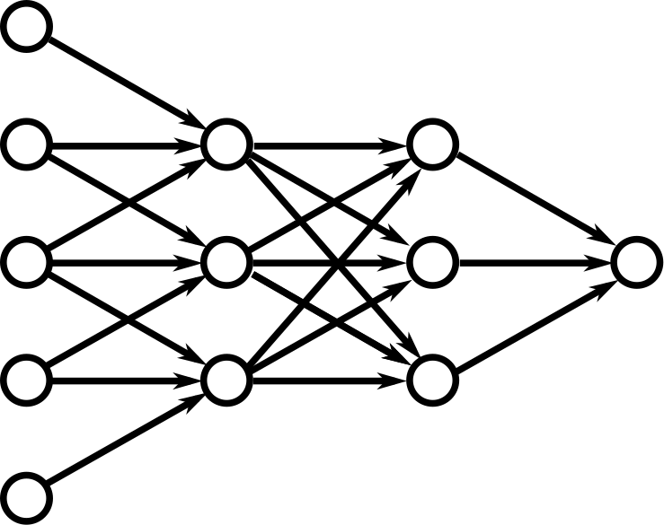 A feed-forward neural network is a network in which the signal enters at the left, flows through the network, and exits at the right without looping backwards on itself. An example network is shown here: