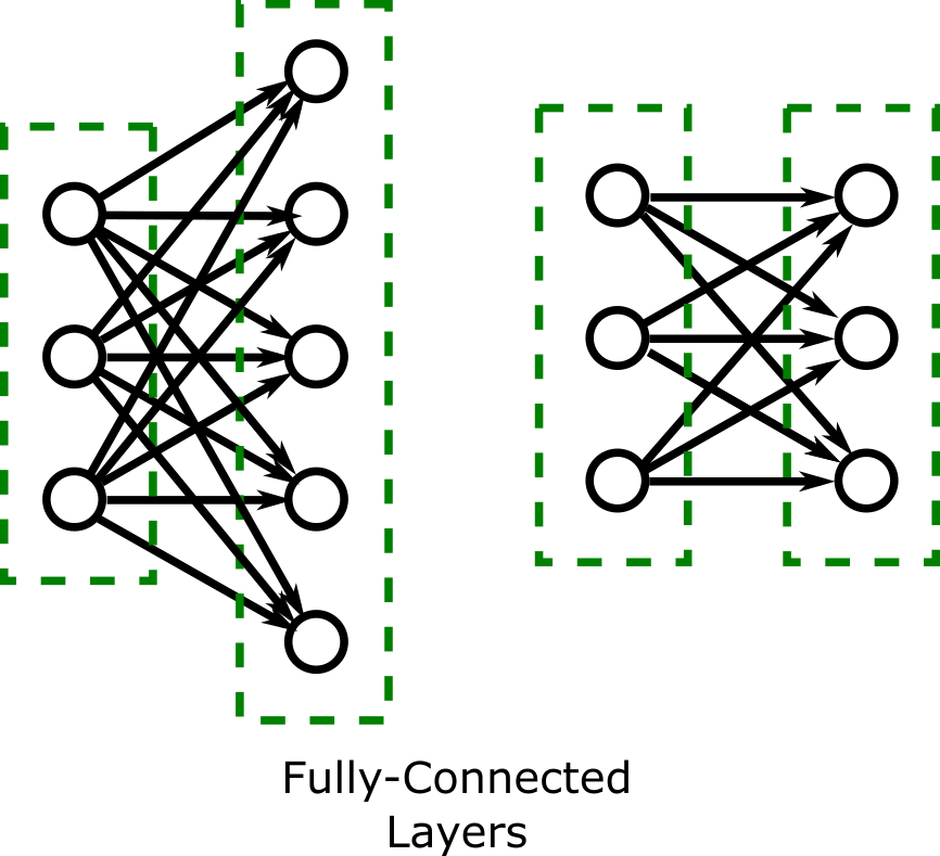 The figure below shows how the fully-connected layer changes when the user (client code) selects a layer size of five or three.