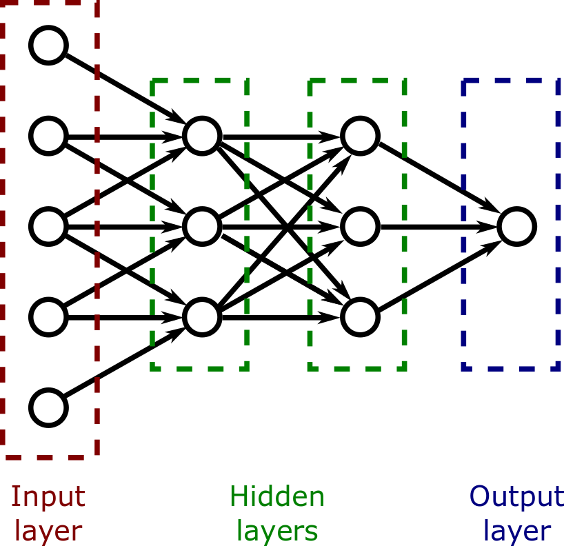 The values of the input layers, on the left, come from some external data such as the pixel values in an image or the audio samples from an audio stream. The value of the single node in the output layer indicates a decision. If the value is high, it could indicate that the image contains a picture of a cat, and if the value is low, it could indicate that the image contains a picture of a dog. The middle two layers are called "hidden layers." A deep neural network is a network that contains many hidden layers.
